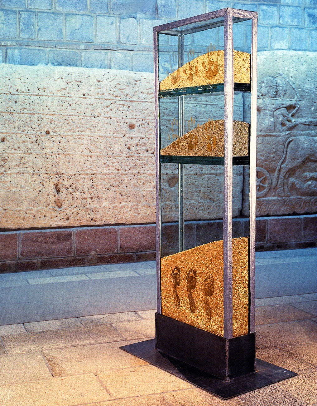 - I chose exactly 12 points from the orthostats in room A. The coffers of memory should stop in front or beside these reliefs and talk with them of yesterday and today. Most of the “objects” depicted in these reliefs are still found and are still being produced in the same places. This continuity should take its place in the coffers of memory. Exactly like my glass balls and traces of bodies that I have defined as life itself. Traces of a human being.